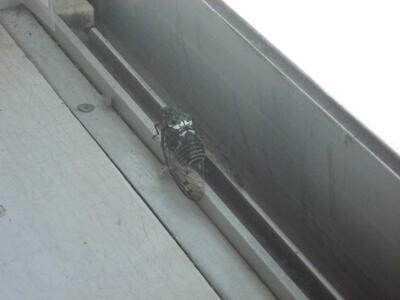 木の上では、まだたくさんの蝉の声が響いています。( ↓ 校舎のはじにセミがとまっていました。このあと元気に飛び去りました。)
