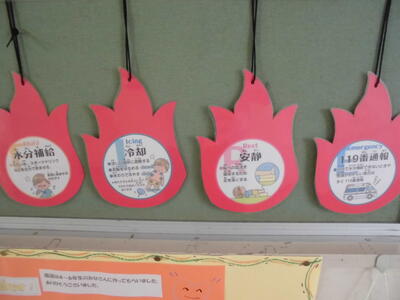 ( ↑ 保健室前の掲示では、熱中症対策を「F」「I」「R」「E」の4枚のカードで示しています。裏返すと対策「Fluid(水部分補給)」「Icing(冷却)」「Rest(安静)」「Emergency(緊急=119番通報)」が出てきます。)