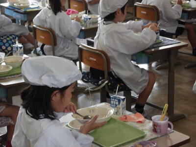 ( ↓ 担任の先生におかわりを盛ってもらう人もいます。給食後には「おいしかったぁ~!」と言っている人もしました。)