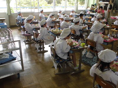 ( ↓ 給食の様子。ウイルス感染拡大防止のため、グループを作らずに周りと間隔をあけて、お話をしないで静かに食べます。)