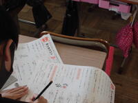 ( ↑ 3年生の社会。スーパーマーケットで商品を販売する工夫などを考えています。)