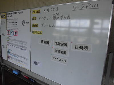 6年生の音楽室で音楽の授業です。ウイルス感染拡大防止のため、大きな声で歌ったり楽器を演奏したりすることをおこなわずに、映像や音楽を聴いて気がついたことなどをワークにまとめています。黒板や掲示物を工夫して授業をおこなっています。子供たちも集中して取り組んでいます。