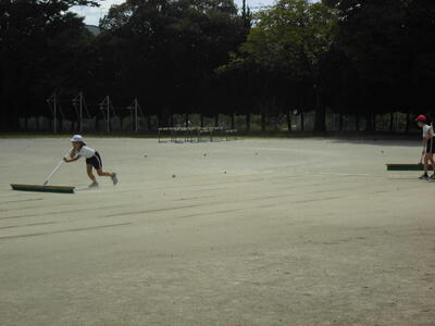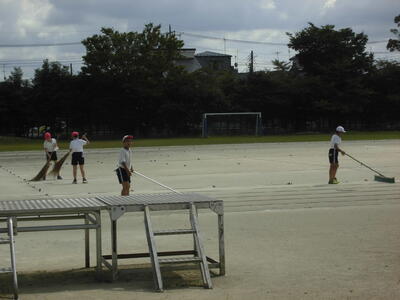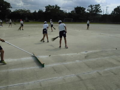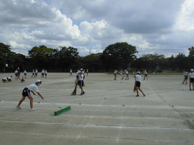 校庭では、運動会にむけて校庭の整備が始まりました。子供たちが校庭を掃いたり、雑草を抜いたりしています。