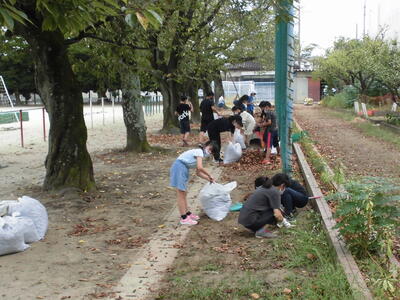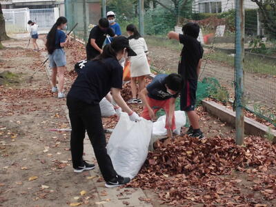 ( ↑ 栽培委員会。校庭の落ち葉掃きや環境整備をおこないました。)
