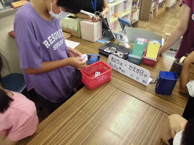 ( ↑ 図書委員会の図書の整備、貸し出しの準備。)