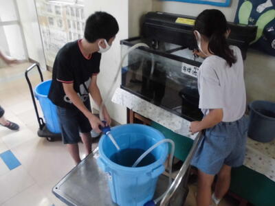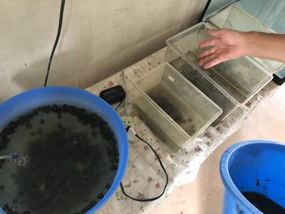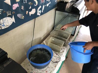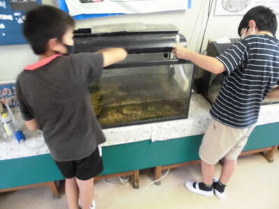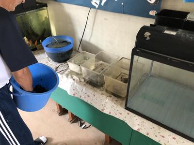 ( ↓ 木曜日の放課後。ホタルの幼虫を育てるために、校長先生が近所の用水路でタニシをとってきました。先週、5年生の先生もとってきたので、その分とも合わせて、けっこうな数となりました。夏にきれいに舞うホタルも、この時期にタニシを育てるところから始まります。)