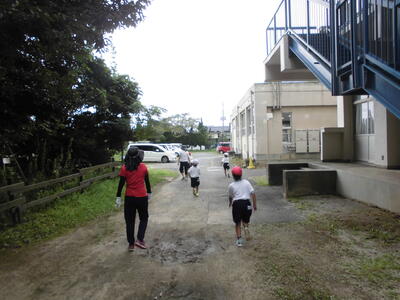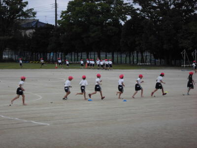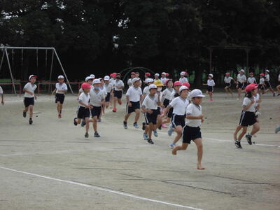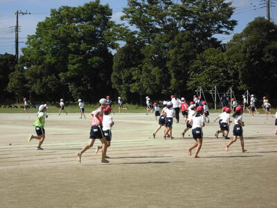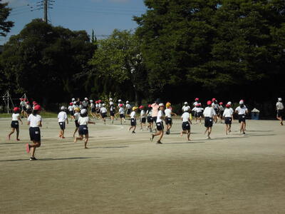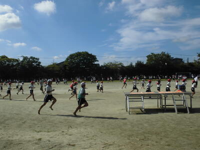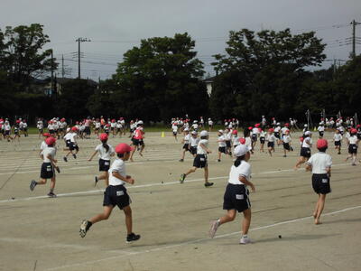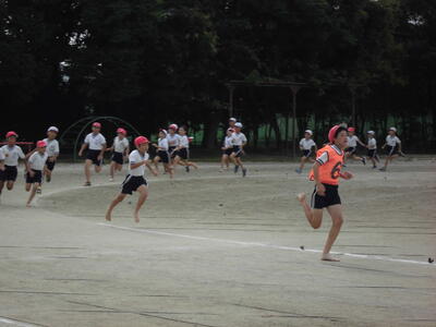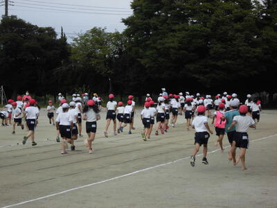 本日の朝は全校運動の時間「さわやかタイム」です。自分自身の体力向上や運動会を目標に、子供たちは元気に校庭を走っています。
