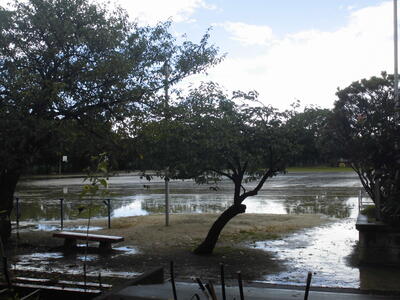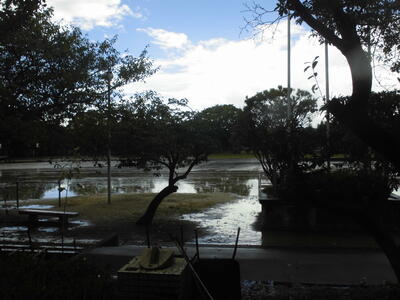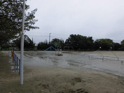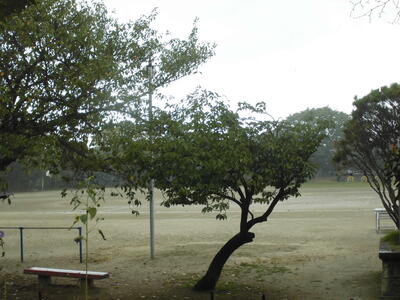 ( ↑ 校庭には水たまりが出来ていますが、空は晴れ、樹上ではセミが鳴いています。)