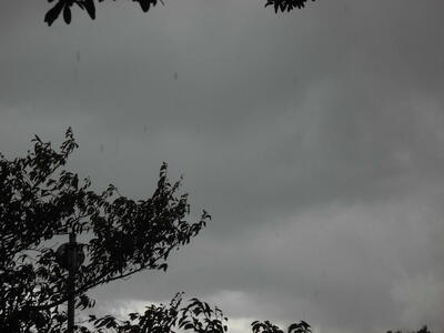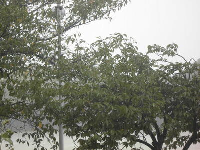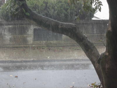 ( ↓ 10:40 かなり激しい雨がたたきつけるように降ってきました。風も強く、木の葉も舞っています。)