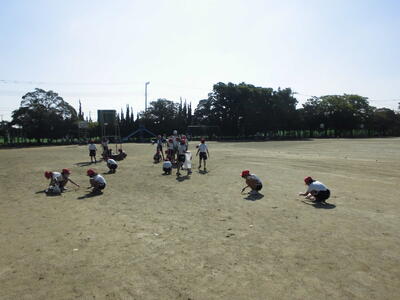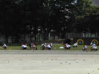 ( ↓ 赤・白にわかれての、大玉おくりの練習です。)