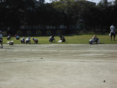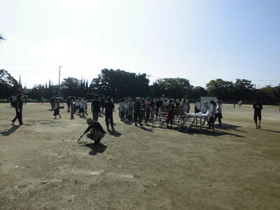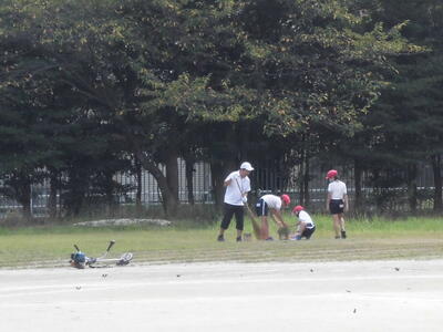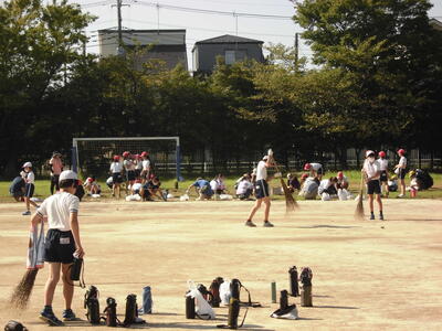 子供たちは、教室に戻ってお弁当となります。校庭では、保護者のみなさんにご協力いただいて、片付けかが始まりました。