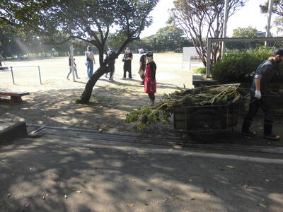 13:00 PTA役員やおやじの会の方々、お手伝いいただいた保護者の皆様にご協力いただき、校庭の片付けもいったん終了しました。このあと、おやじの会の方々にご協力いただき、地域にお借りしたテントの運搬・返却をおこないました。また、子供たちはお弁当を食べて午後、用具の片付けなどを行いました。