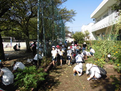明日は第一土曜日となるため、授業日として子供たちが登校します。一校時には、保護者の方に来校いただき親子除草を行う予定です。