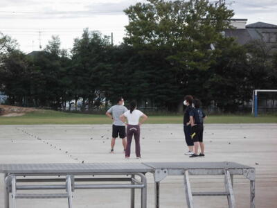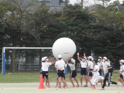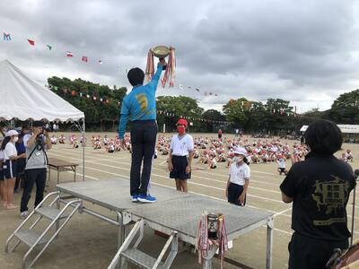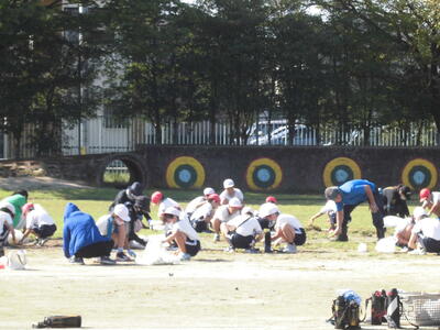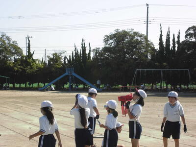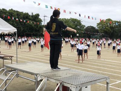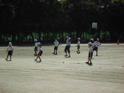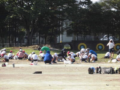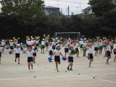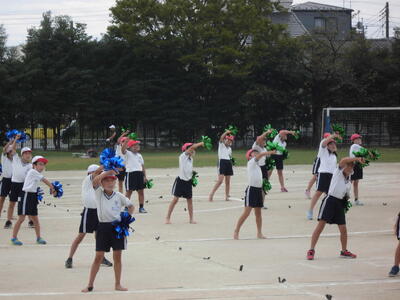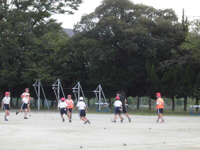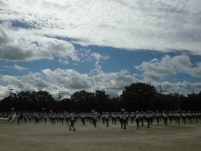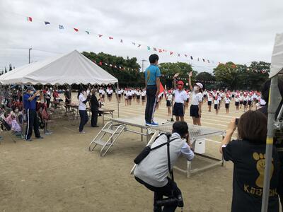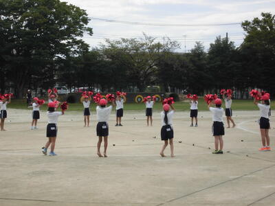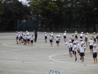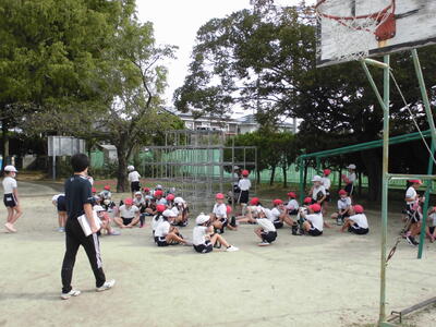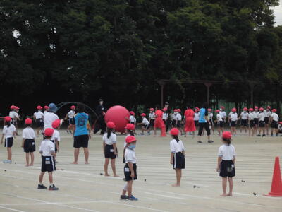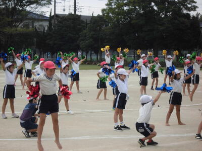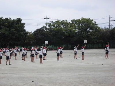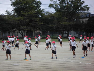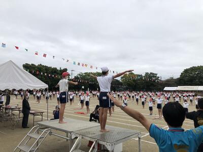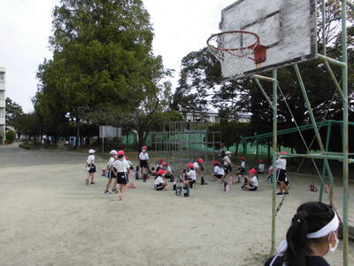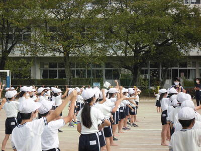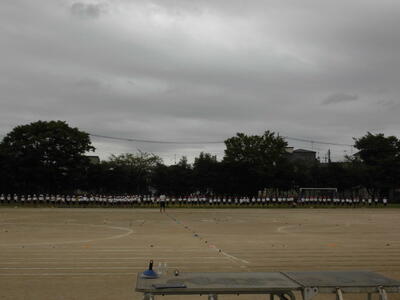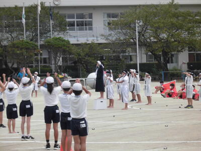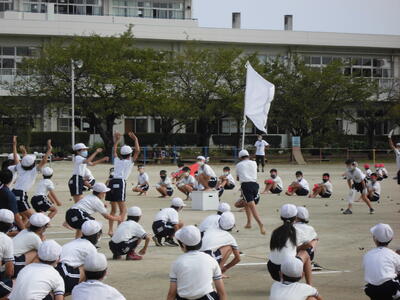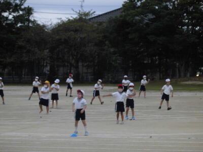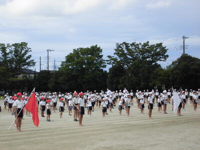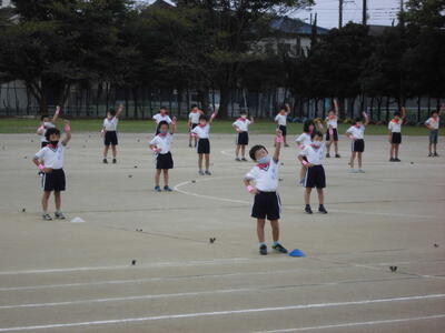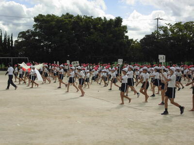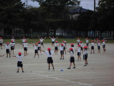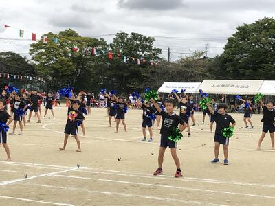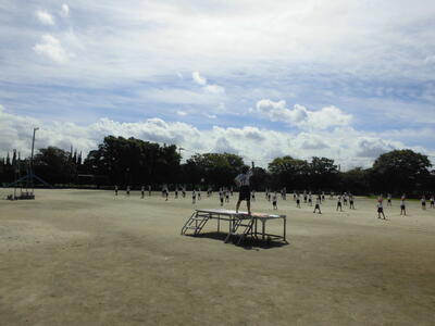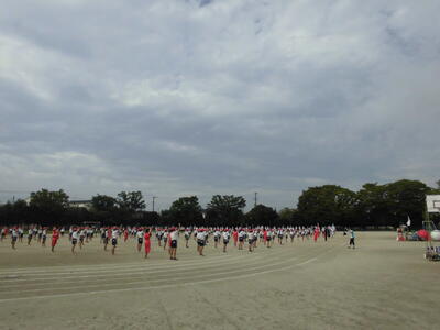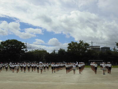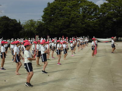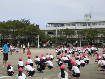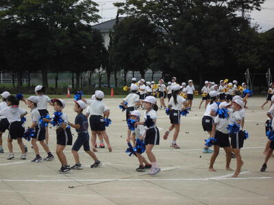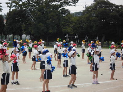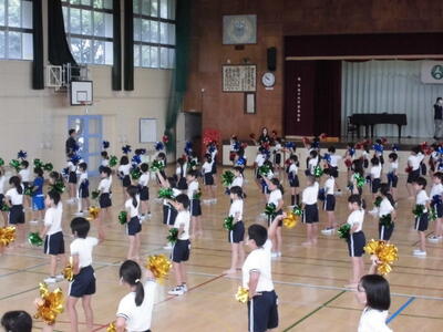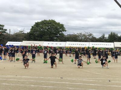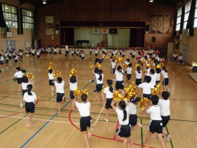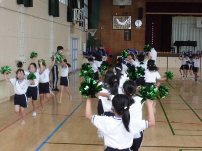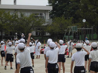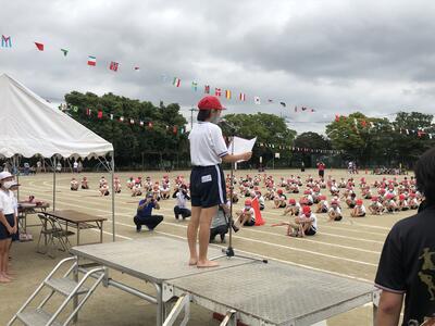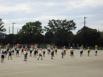朝は、全体で応援合戦の練習をおこないました。密を避けるために、となりとの間隔をじゅうぶんにあけたり、マスクをしたまま声を出したりと、例年とは違う形での取組ですが、子供たちは精一杯に練習に励んでいます。