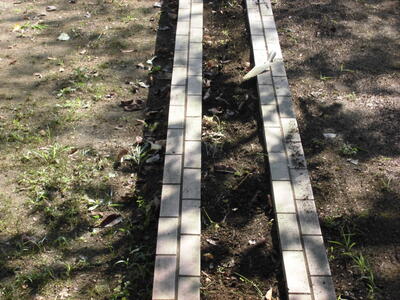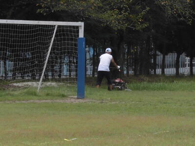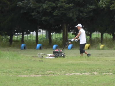 ( ↓ 金曜日。教務主任の先生が、校庭の草を刈っています。刈っても、すぐに伸びてしまう草を、定期的に刈り取っています。)