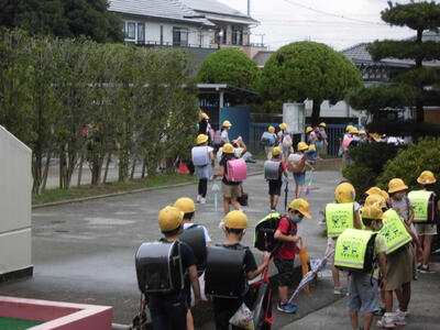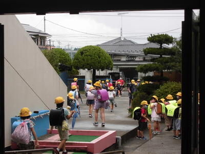 本日も、一日、天候が不安定でした。急に暗くなって、突然強い雨が降ってきたり、やんで晴れ間が見えたりと、変化が激しい一日でした。下校時間帯の強風や雷雨を心配しましたが、さいわい下校時間には晴れ間が出て、雨も降っていなかったので、子供たちは安全に下校しました。(写真は下校時の様子)