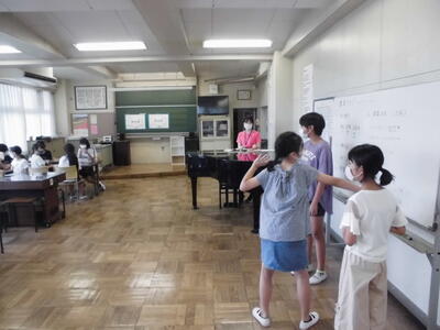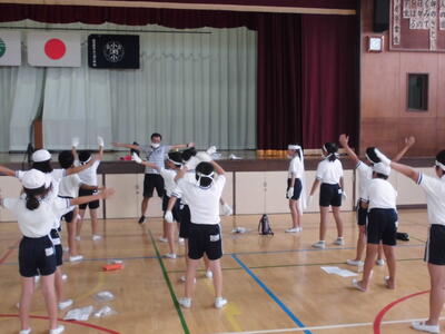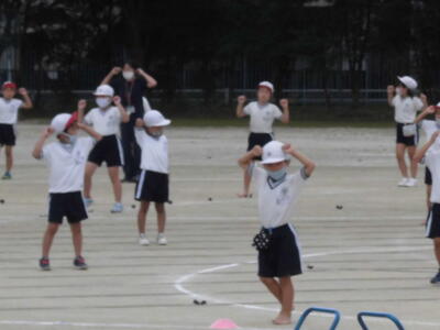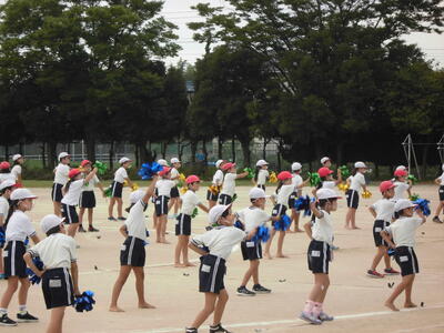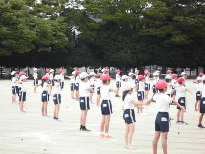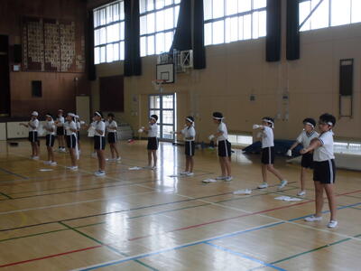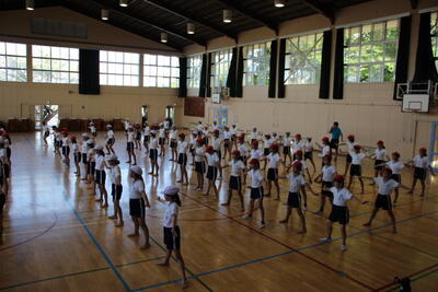 中学年(3・4年生)の合同練習です。ダンスの動きを合わせています。