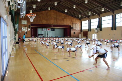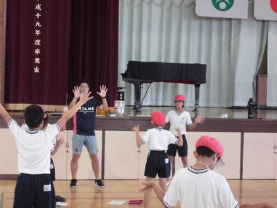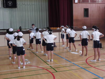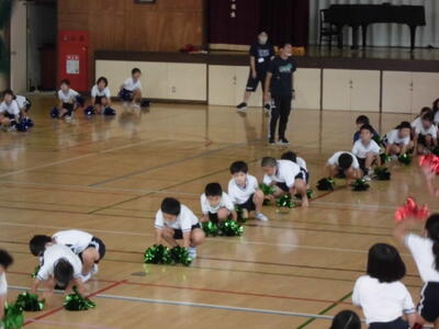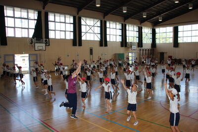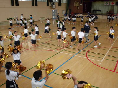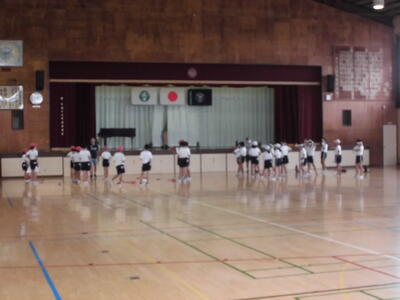( ↓ 3・4年生の練習の時は雨が降ってきたので、体育館で練習をおこないました。体育館いっぱいに子供たちの声と笑顔が広がりました。)