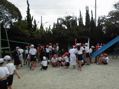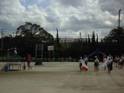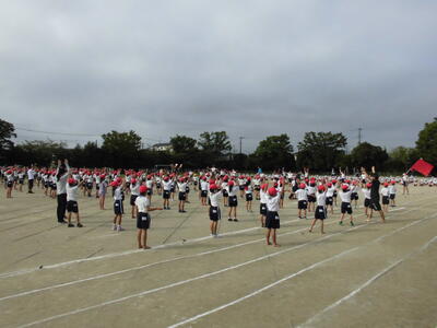いよいよあさってが運動会です。本日の朝は、雨の予報でしたが、運動会練習の時間には雨もあがり、校庭も乾いていたので、全体練習をすることができました。赤組・白組にわかれて、応援合戦の練習のしあげをおこないました。