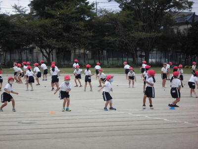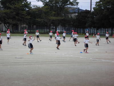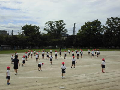 ( ↓ 低学年ブロック、1・2年生の練習。ダンスの時の隊形などを確認しています。)