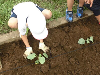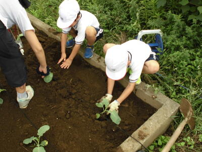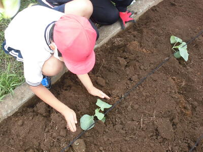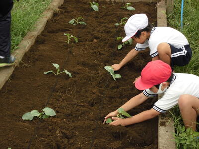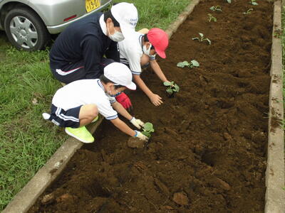 今日は学校の農園に、たんぽぽ・ひまわり学級の子供他たちが、ブロッコリーの苗を植えました。校長先生に教わりながら、ていねいに苗を置いたり、土をかぶせたりしていきました。最後に、自分たちが苗を植えた畑を眺めて、ブロッコリーが元気に育ってくれることを願って、教室に戻りました。