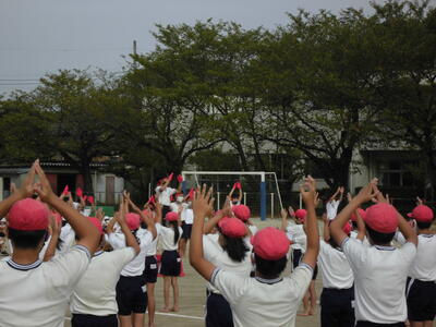 運動会に向けて、今朝の全体練習では、応援合戦を通しておこなってみました。