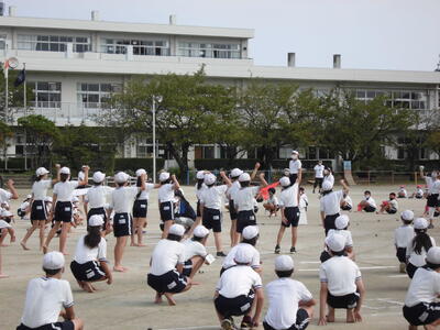 ( ↓ 高学年ブロック。5・6年生の合同練習では、ソーラン節に取り組んでいます。)