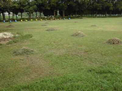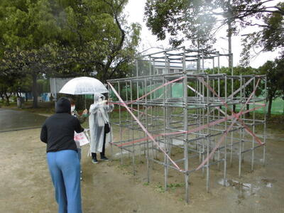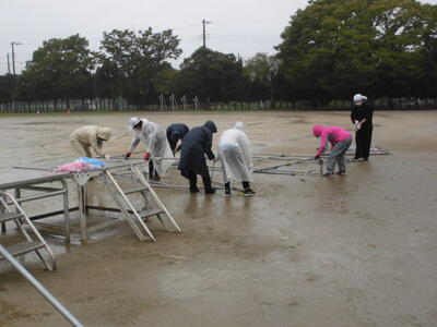 あいにく午後からは雨となってしまいました。予定していた運動会準備もじゅうぶんできませんでしたが、それでもPTA役員さんや、おやじの会の方のご協力で、校庭の準備(テント設営、くい打ちやロープ張り、遊具の結索など)が進みました。