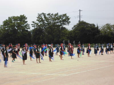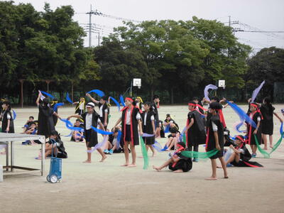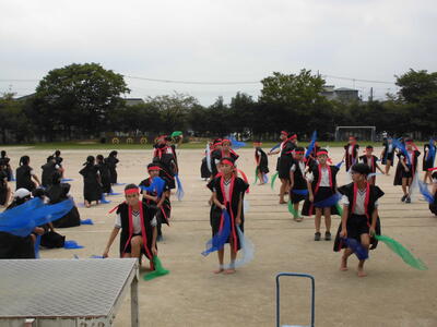 ( ↓ 先週の運動会練習の様子。高学年が、衣装をつけてスカーフを持ちながら、ダンス・ソーラン節の練習をしているところです。)