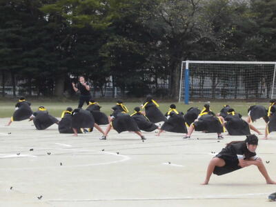 ( ↓ 応援合戦の練習。応援団も衣装をつけて、本番さながらの練習をおこないます。)