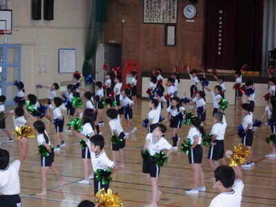 ( ↓ 先週の低学年の練習。1・2年生がダンスに励んでいます。入退場も曲に合わせて元気に行動しています。)
