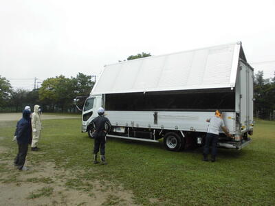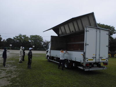 ( ↓ トラックを手配していただき、近隣からテントを借りてきました。)