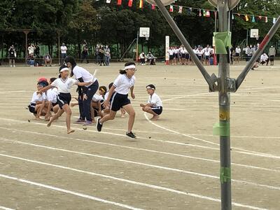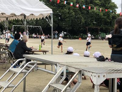 9:30 プログラム5番、5年生の徒競走100メートル走が始まっています。