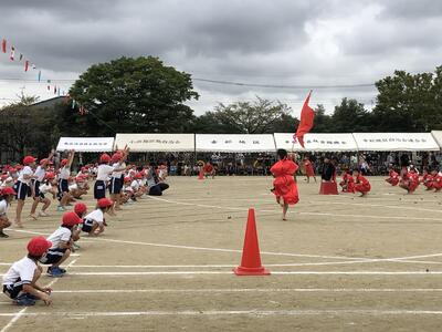 11:45 プログラム15番、1・2年生による紅白選抜対抗リレーです。