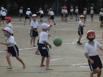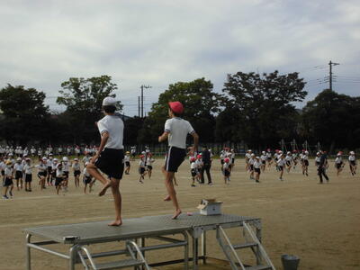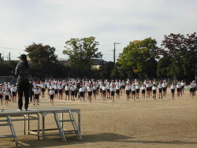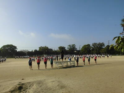 7:50 毎朝の一運動(いちうんどう)が始まっています。陸上大会は4年生以上ですが、1~3年生も朝の運動は元気に参加しています。