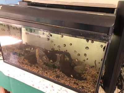 ( ↓ 用務員さんが、水槽を直してくれました。水が漏れていたのを、コーキングなどで直して、この水槽でタニシや他の魚を育成します。)