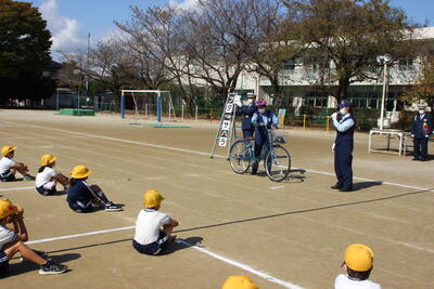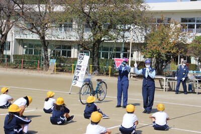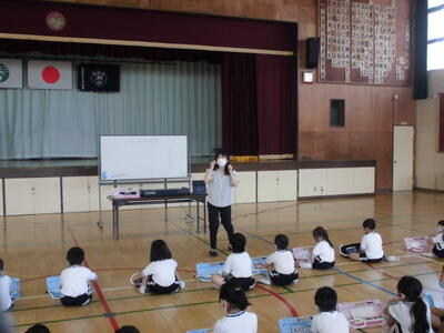 ↑ 今月の生活目標は『自分から先にあいさつをし、返事ははっきりとします』です。三年生の先生と子供たちによる、今月の生活目標の確認がありました。三年生代表の子供たちがあいさつについて、実演して見せてくれました。