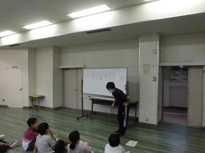 (密を避けるために体育館でおこないました。講師の方のお話をしっかり聞いています。))