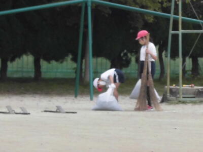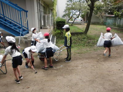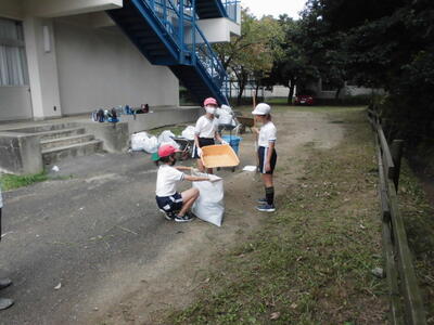 今回は、1~6年生のまでの異年齢集団のたてわり班にわかれて、班ごとに上級生のリーダーシップのもと、校庭で美化活動をおこないました。