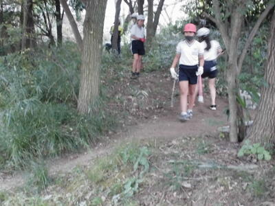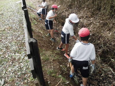 4年生が総合的な学習の時間で、小渕小の自然環境について学習しています。小渕小の自然の森(通称:トトロの森)では、担当グループがホタルの池や水路、その周辺をきれいにしました。