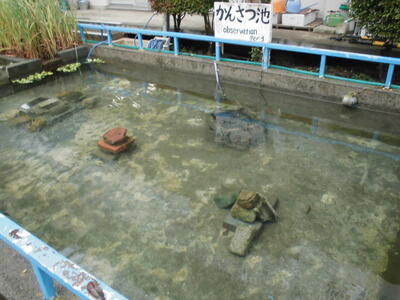 このあと、観察池に水を張り、別の水槽に移っている魚たちを戻します。多くの子供たちが、また今後も、この池の生物を観察してくれることでしょう。