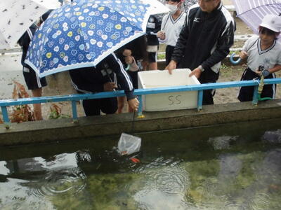 ( ↓ 子供たちが、少しずつ、網で魚を池に戻していきます。)
