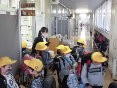 ( ↓ ぶじに学校まで帰ってきて、子供たちの進行到着式です。クラス代表の子供たちが感想を発表しました。)