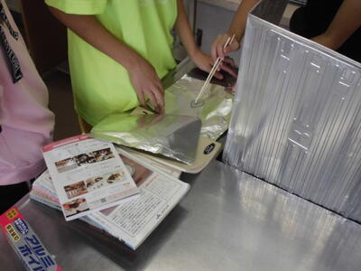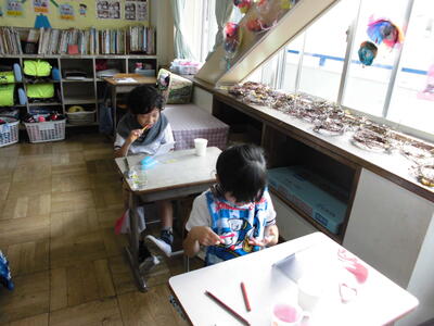 ↓ 手芸・アートクラブでは、プラ板を作成しています。プラスチックの板に絵を描いて、レンジで加熱して圧縮しています。