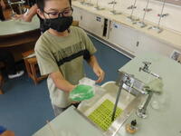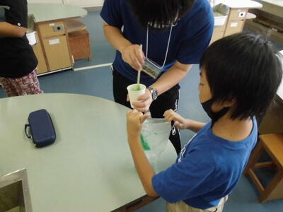 ↓ 科学クラブでは、スライムをつくる実験をしました。それぞれのこのみの色や形に調節して、不思議な感触のスライムができあがりました。
