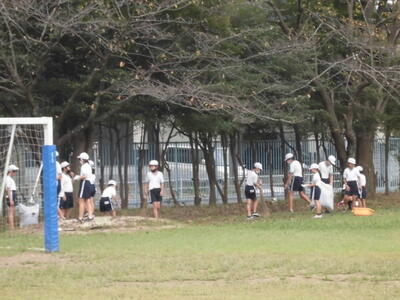 7:20 先生たちが校庭で陸上大会のための準備を始めています。