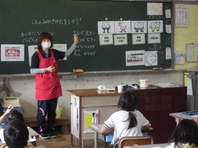 ( ↓ 本日、5年生の教室では、保健の先生による「歯みがき教室」の授業がおこなわれました。映像などで確認しながら、実際に歯みがきをしてみました。)
