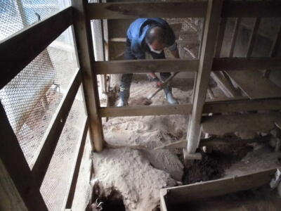( ↓ ウサギが掘った穴をうめたり、不安定になった柱を固定したりします。)