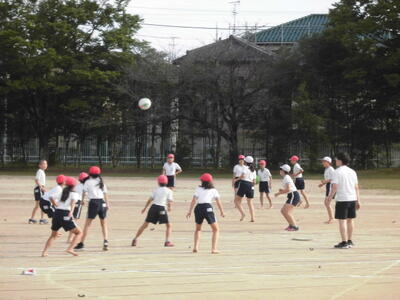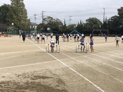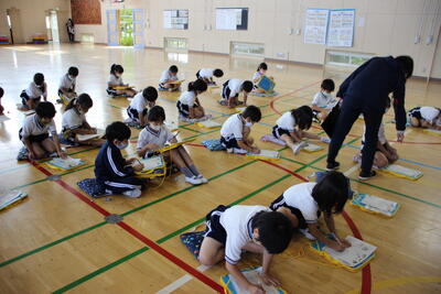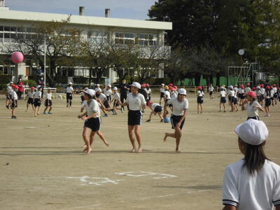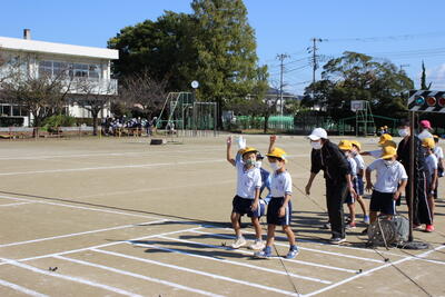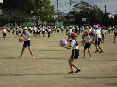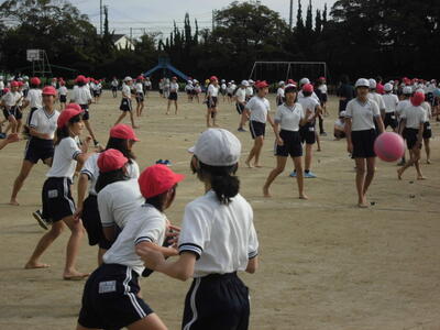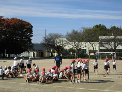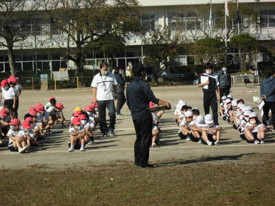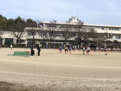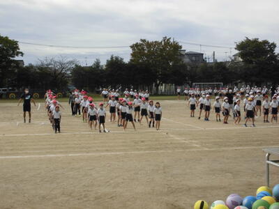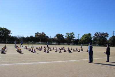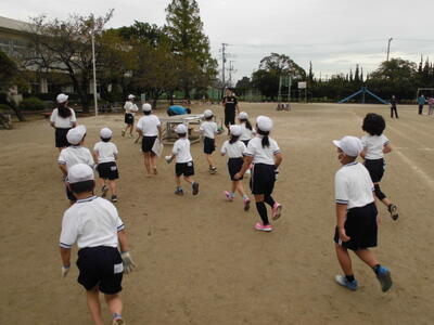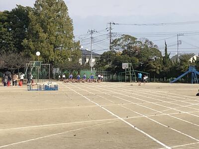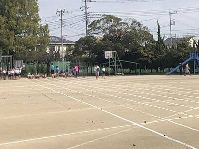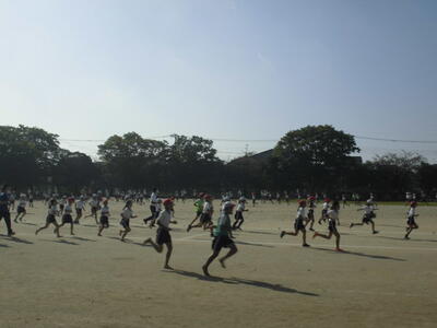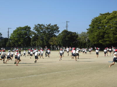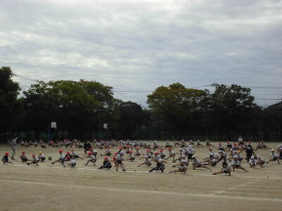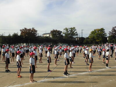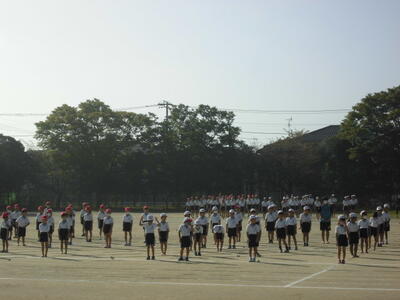 7:50 毎朝の一運動(いちうんどう)が始まっています。陸上大会は4年生以上ですが、1~3年生も朝の運動は元気に参加しています。