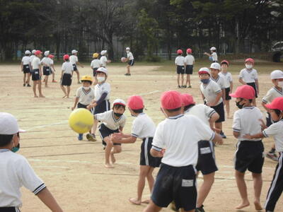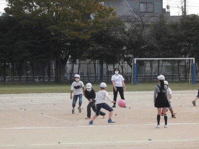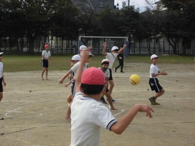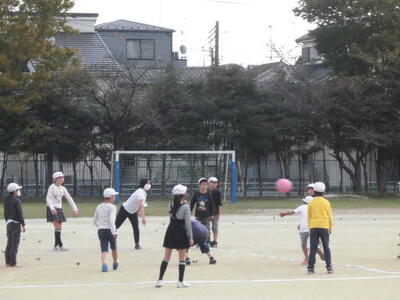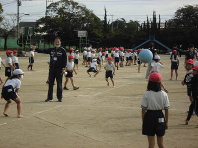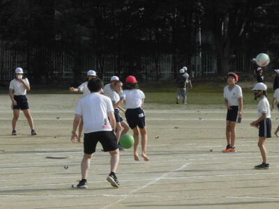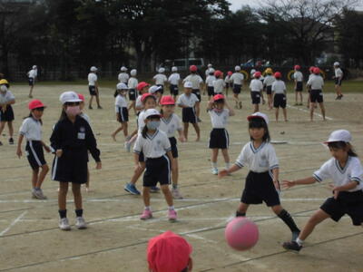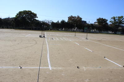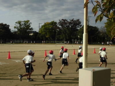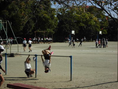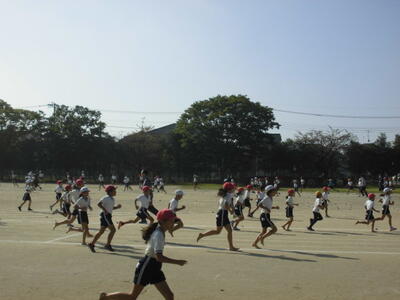 秋晴れの空の下、昼休みには、子供たちが校庭を元気に走り回っています。